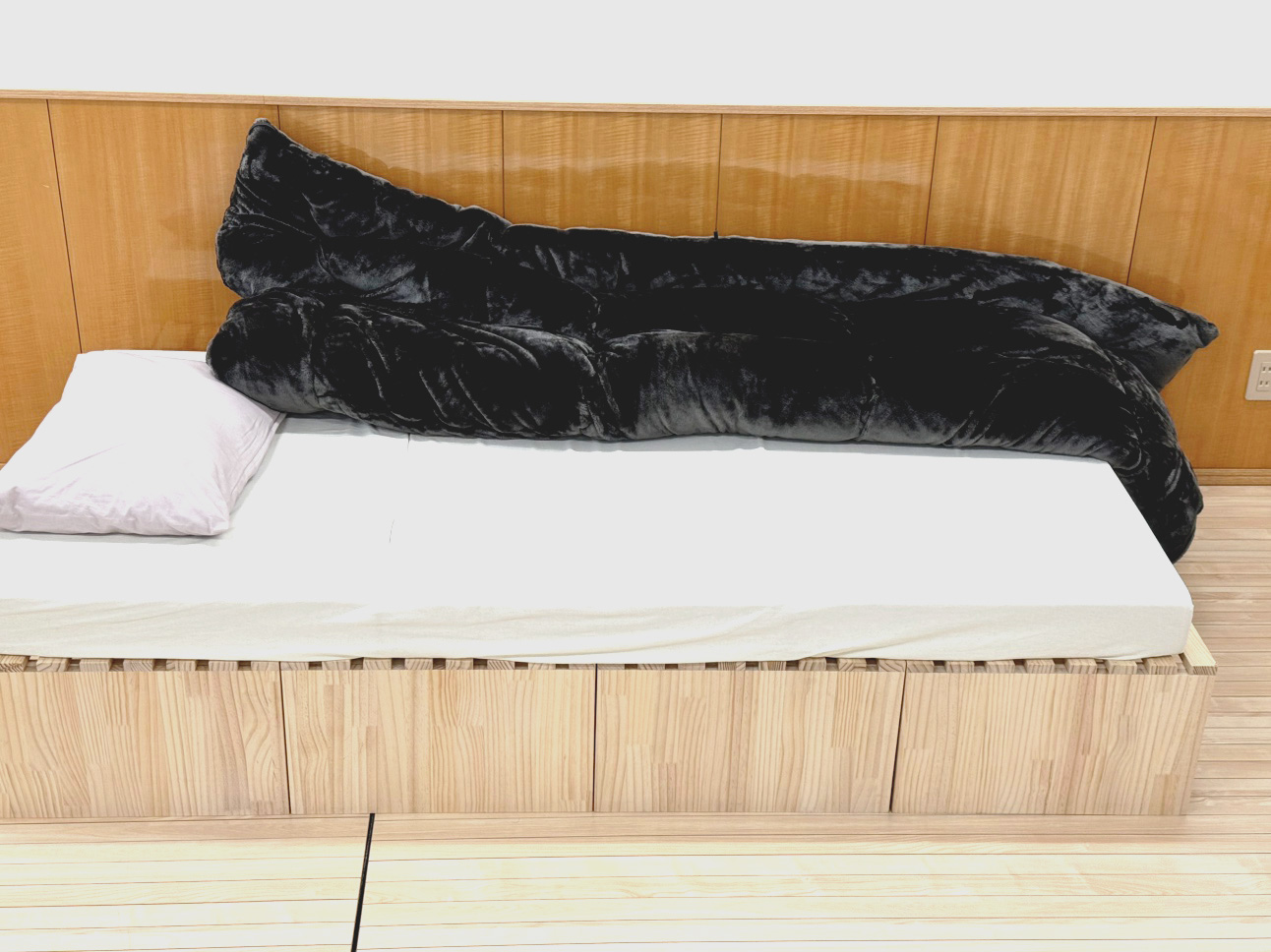 (写真:ワンサイズ小さなマットレスを配置してステージベッドを実現)