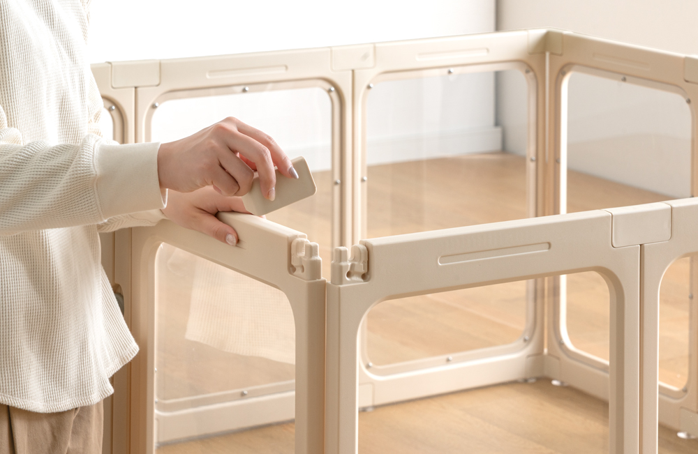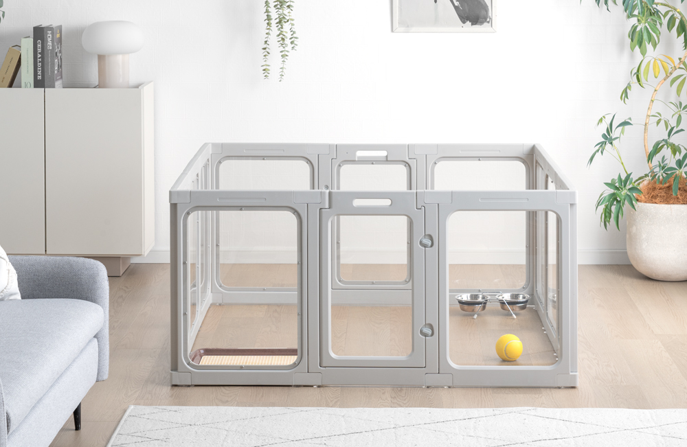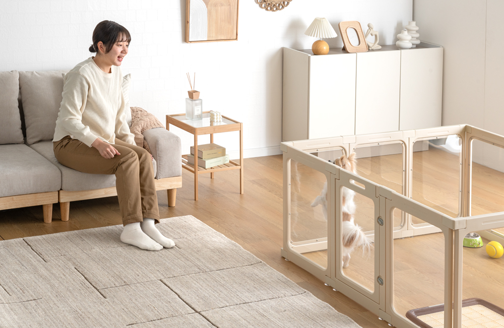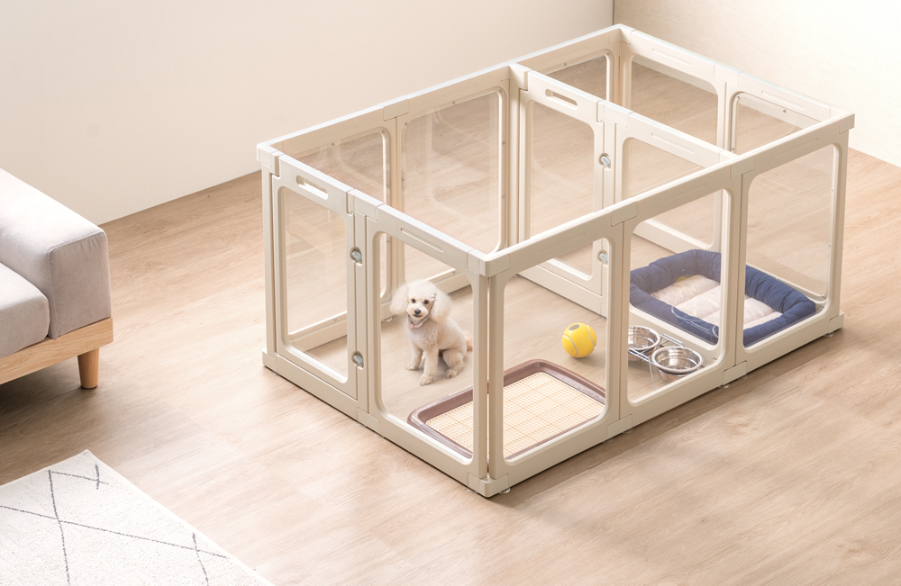 また、クリア設計にすることでわんちゃんも飼い主さんが見えて安心したり、囲われ感がなくストレスを感じにくかったりというメリットがあります。またスチール製の一般的なサークルだと柵に引っかかってケガをしたりと心配な点もありますが、本製品はそのような心配なくご使用いただけます。