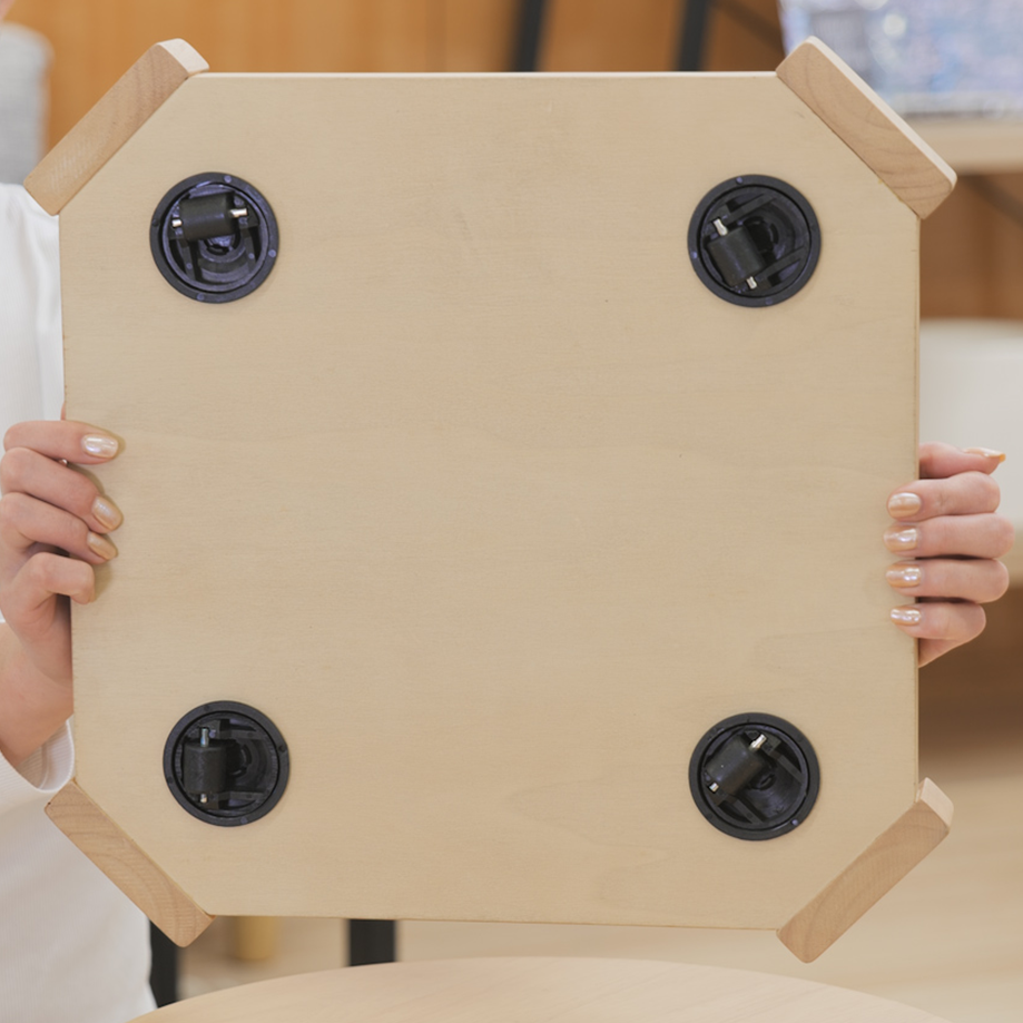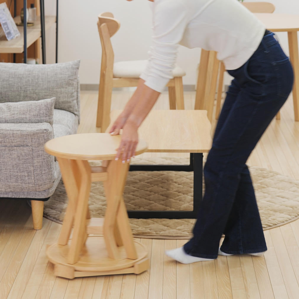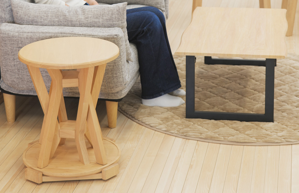 「サイドテーブルになるスツール」すべてに対応した専用のキャスターベースも同時に発売しております。どちらも女性1人でも移動できる重さですが、よりサッと移動ができるように開発されました。またサイドテーブルとしてご使用いただく際に座面部分が直接床にあたることに抵抗がある場合は、キャスターベースに乗せたままサイドテーブルとして使用することができ、床にあたることに抵抗なくご使用いただけます。