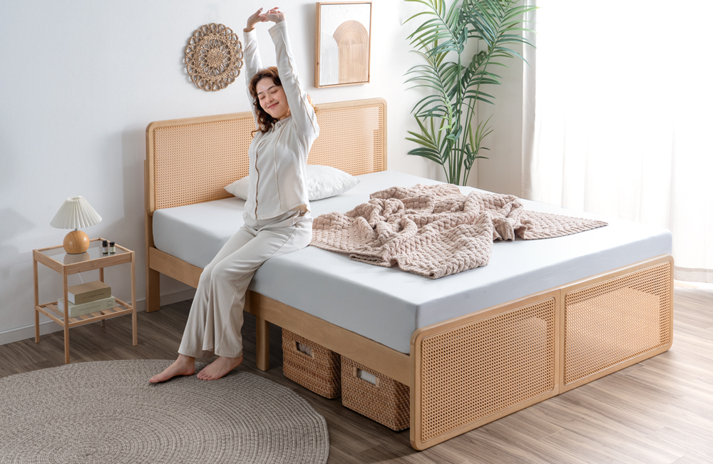 ぬくもりを感じる、天然木フレームとヘッド・フットボードには編み目が映えるラタン調デザインにすることでナチュラルなインテリアやリゾート風のお部屋にもぴったりのデザインになっています。