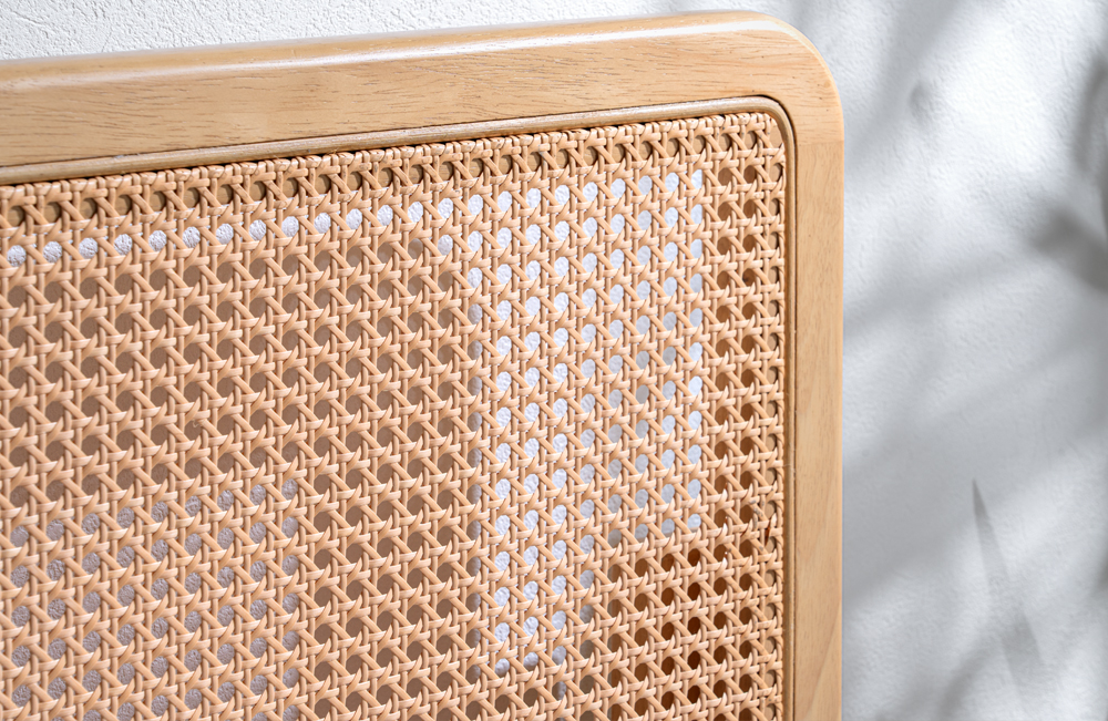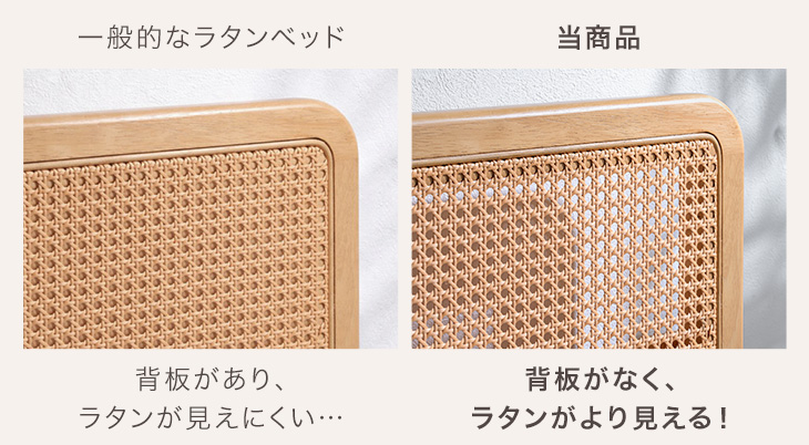 一般的にラタン部分の後ろに背板がありラタンの編み目が見えにくいものがありますが、本製品は魅せ方にもこだわり、ラタン部分の後ろに背板を設けず、ラタンの魅力である特徴的な編み目や透け感がより綺麗に見える仕様にしています。