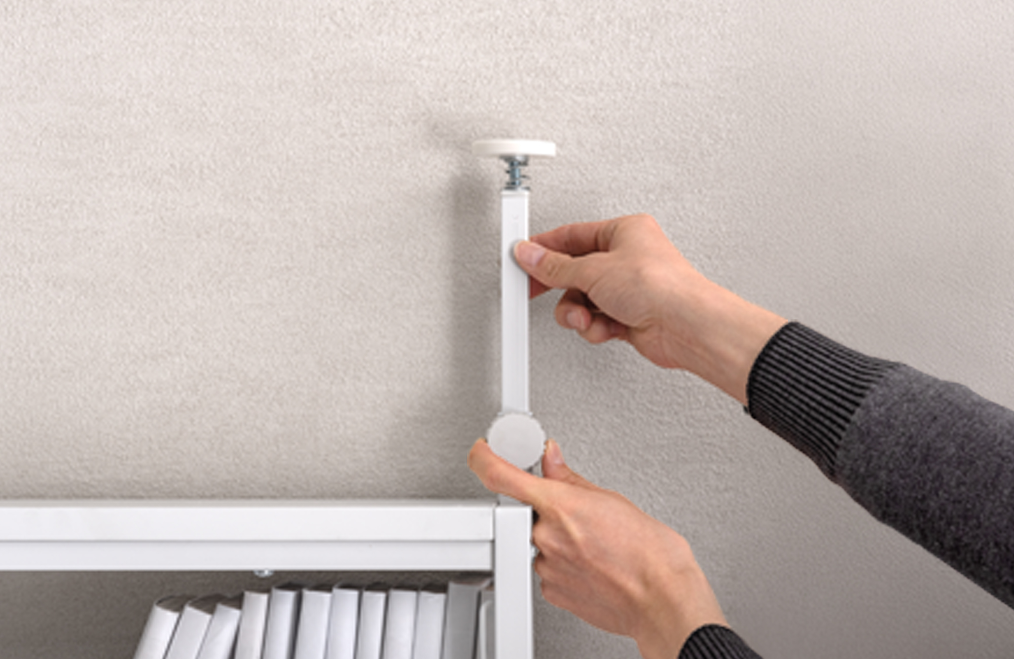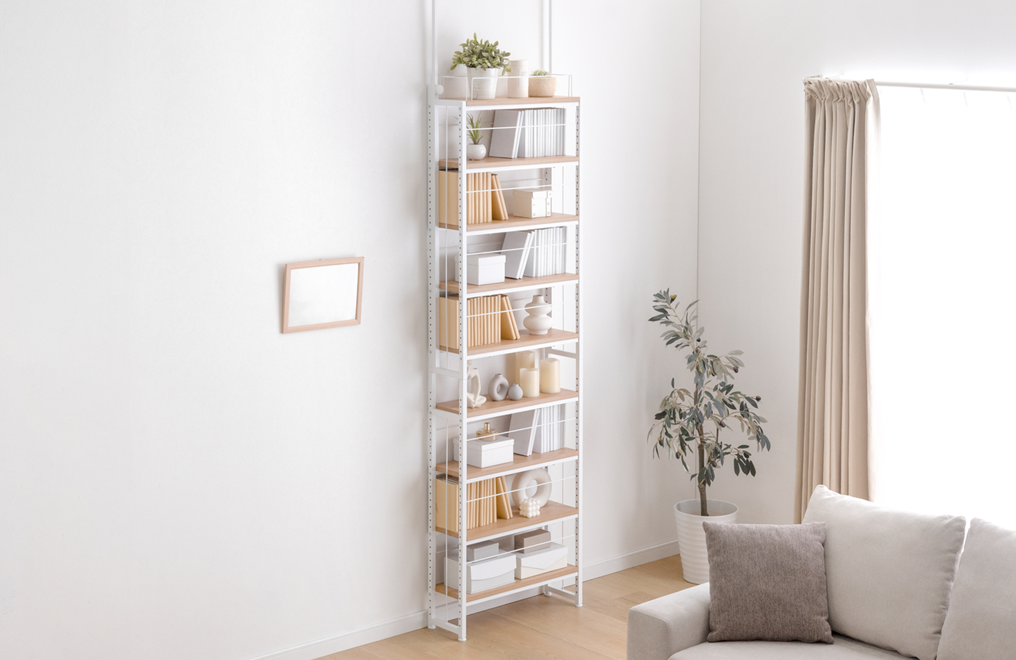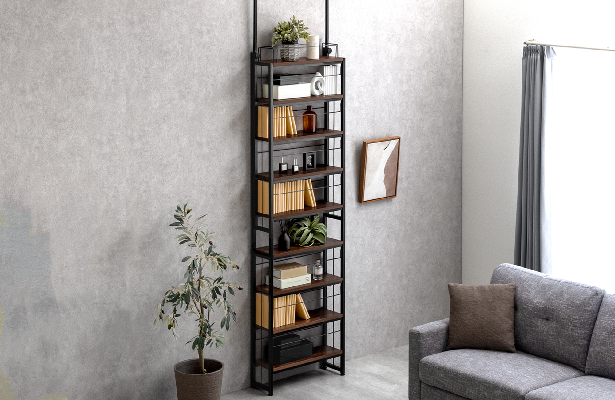 本製品は本棚の床と天井の間で突っ張って固定できる「突っ張り式」を採用しているため、高さのある設計ながらも安定性に配慮した製品となっております。壁や天井を傷つけることなく設置できるため、自宅に傷をつけたくない方や賃貸の方でも安心してご使用いただけます。