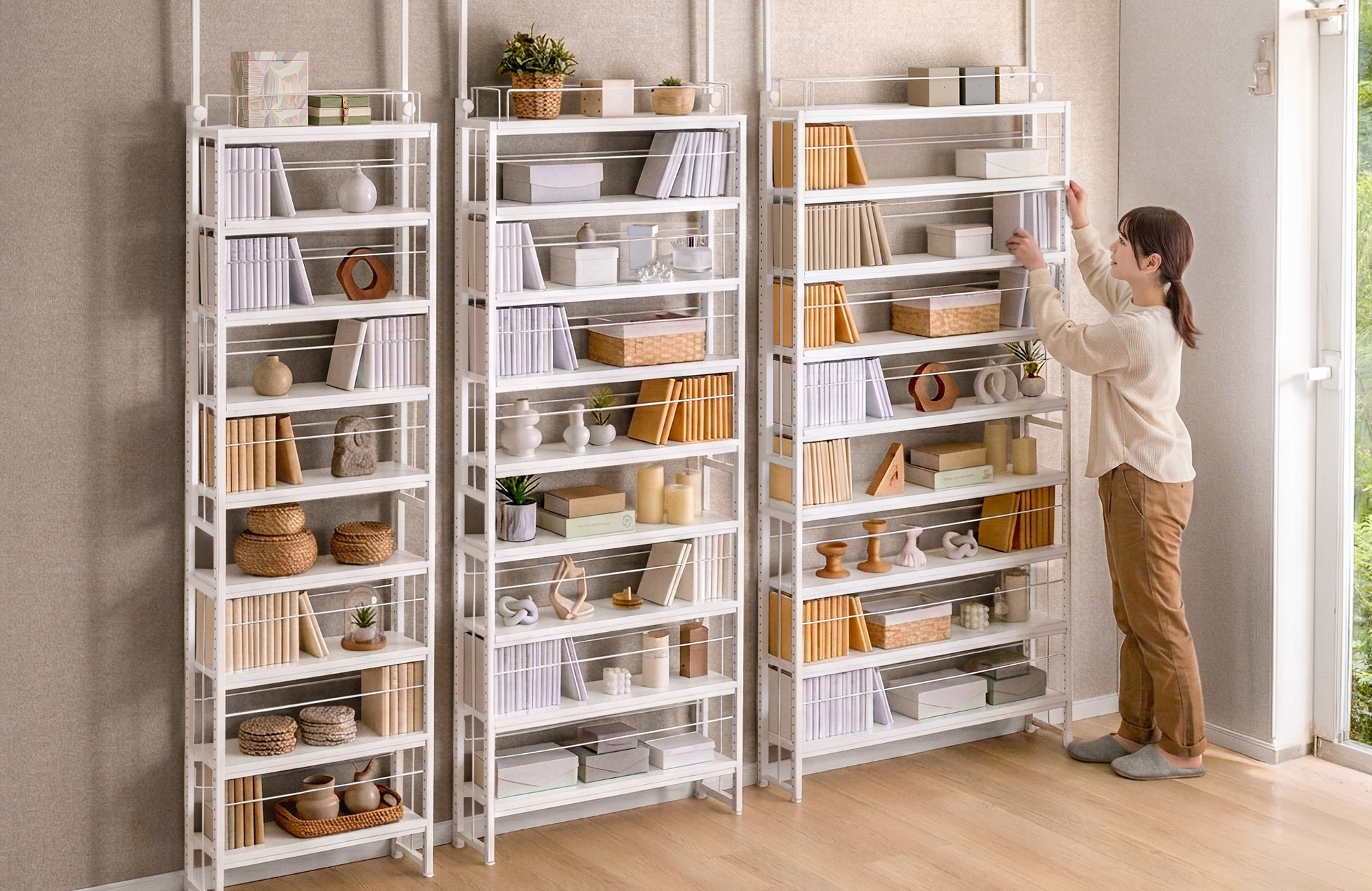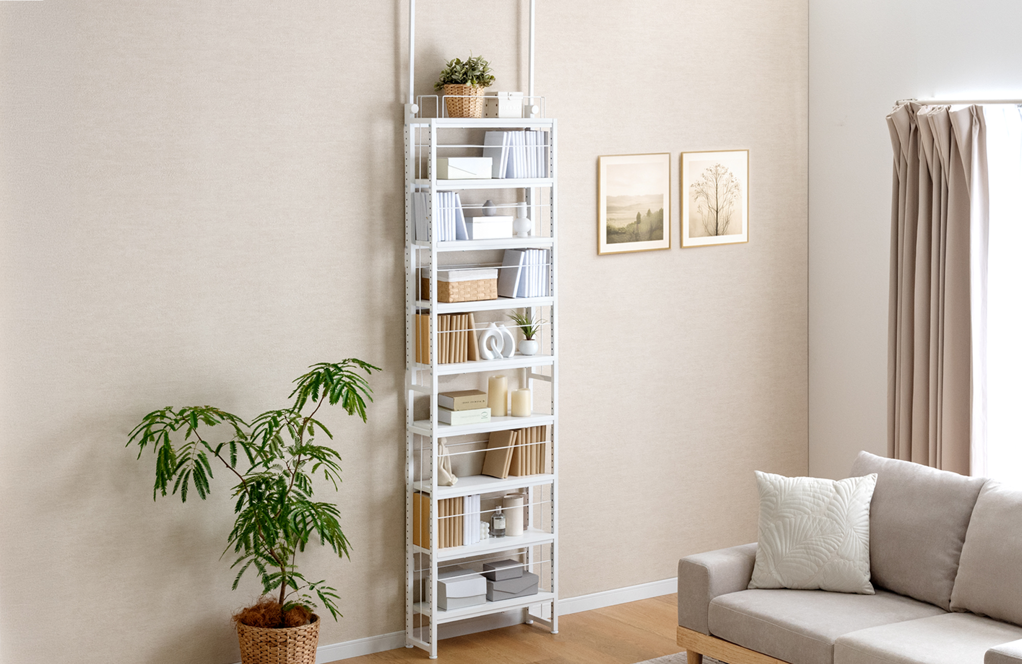 本製品は天井に固定して使用する「突っ張り式」になっており、高さのある設計ながらも安定性と収納力を両立しております。穴開け不要で壁や天井に傷がつくこともないため、賃貸にお住まいの方でも安心して設置可能です。