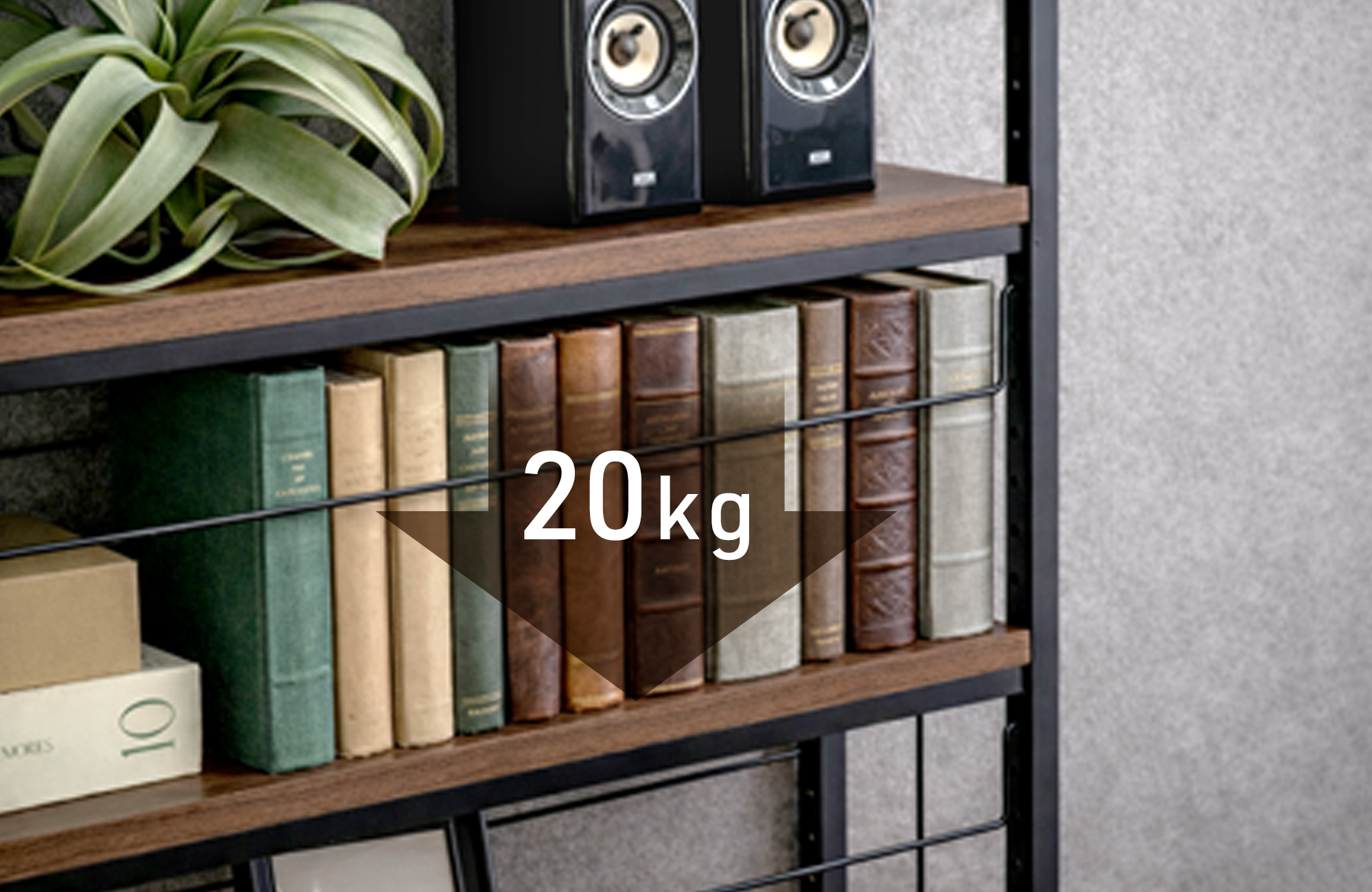 また、可動棚には補強板が取り付けられており、耐荷重が20kgと頑丈なつくりになっているため、重たい本でも安心して収納いただけます。