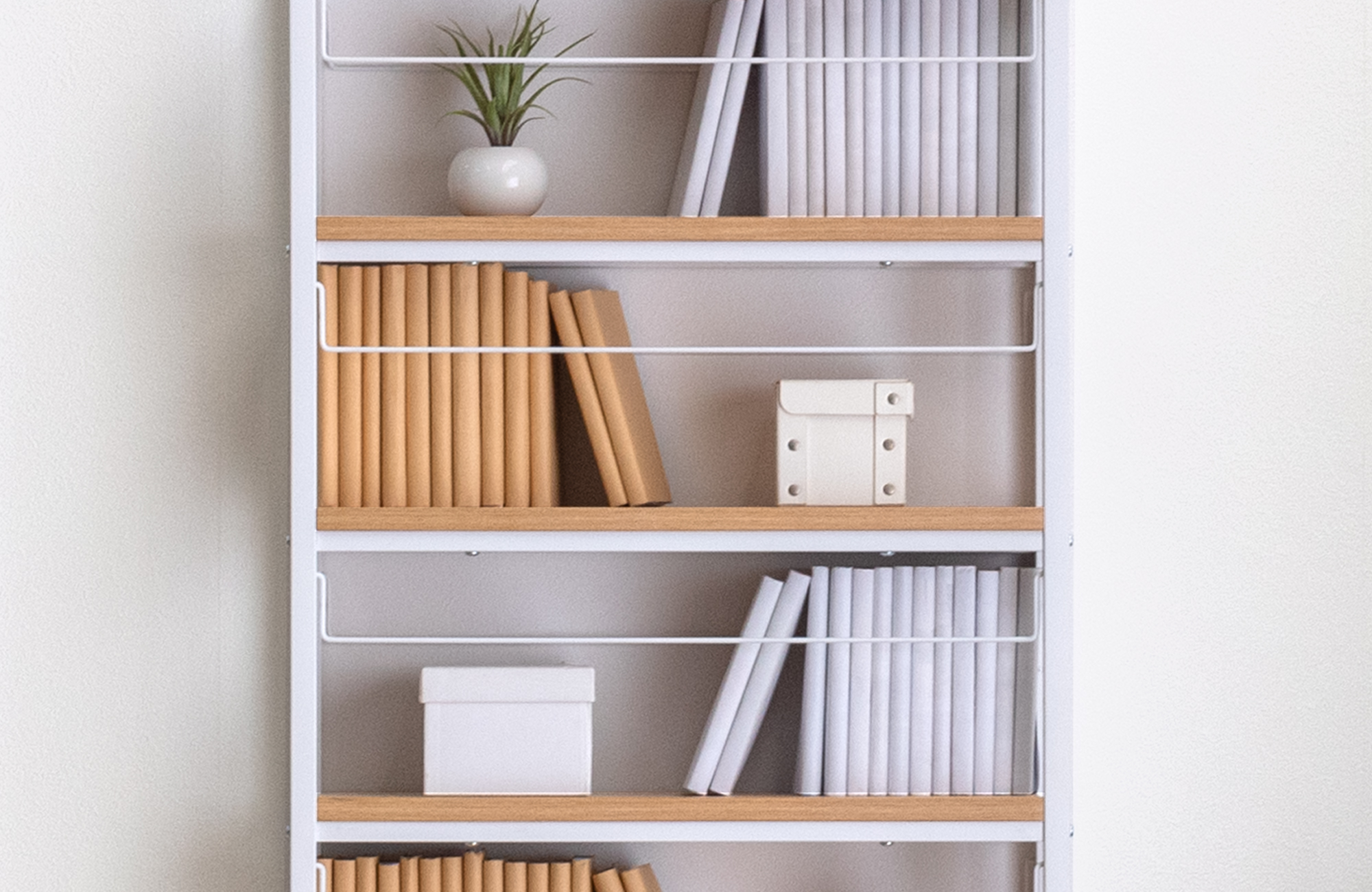 さらに、可動棚の前後には収納物の飛び出しを防ぐ「落下防止バー」が取り付けることができ、上段の本を取り出す際も安心です。