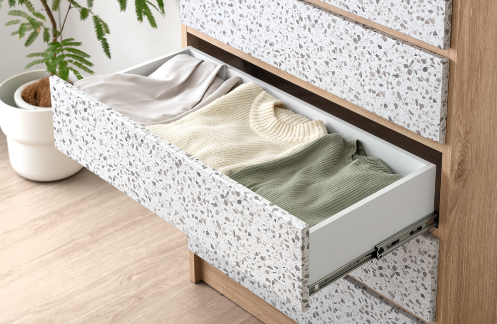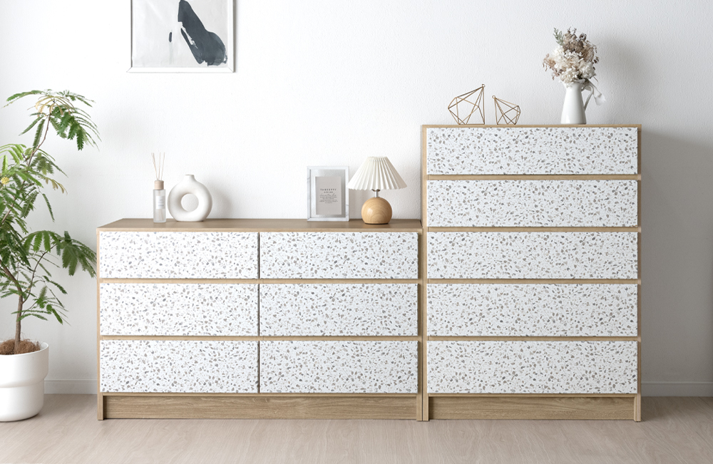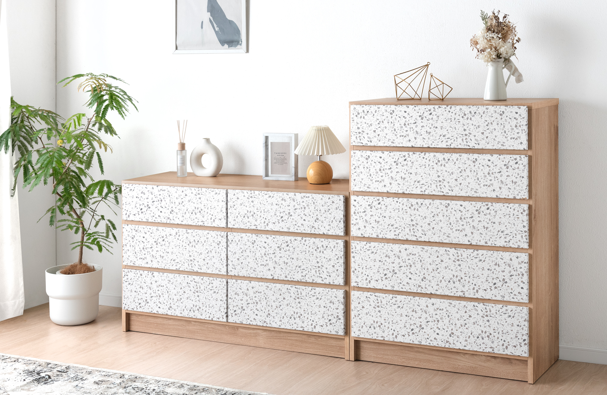 チェストは高さ違いのハイタイプとロータイプの2サイズ展開です。引き出しにはフルオープンスライドレールを採用し、奥の物までスムーズに取り出すことができます。衣類や小物を整理しながら、天板上には写真立てや小物を飾ってインテリアの一部として楽しめます。テラゾー柄と木目調のコントラストが空間に上質感があり、寝室やリビングなどどんな場所にも自然と馴染みます。