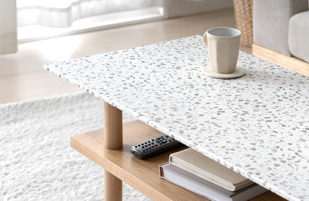 天板には、木のぬくもりを感じる【シャビーアッシュ】【ホワイトウォッシュ】の木目調と、上質な印象の【ストーングレー】の石目調の3色となっています。脚部にはブラックまたはホワイトの脚を組み合わせ、空間に映える2トーンデザインに仕上げました。木目調の【シャビーアッシュ】と【ホワイトウォッシュ】は、あたたかみのあるナチュラルな空間に馴染み、やさしく明るい雰囲気を演出します。一方、石目調の【ストーングレー】は上品でモダンな印象を与え、落ち着いた雰囲気のインテリアにも合わせやすいです。