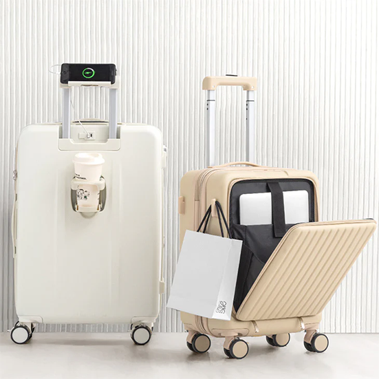 ドリンクホルダー、USBポート、スマホスタンド、容量拡張ファスナー、キャスターロックなどの機能が移動における不便さを軽減します。