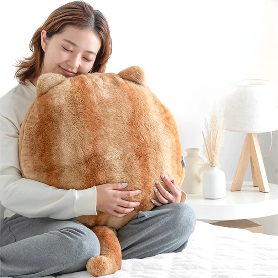 猫の平熱は約39度あり、人間よりも2~3度高いことから、猫が膝に乗った時や触れた時には、ほっとするような温かさを感じられます。本製品はその快適な温もりを再現するために、基布の裏面に+3.8度の温感シートを取り入れており、本物の猫のような温もりを体感いただける仕様になっています。さらに中綿には吸湿発熱機能のある素材を使用してくるため、寝ている間に汗をかいても蒸れにくく、暖かさを保てる製品となっています。