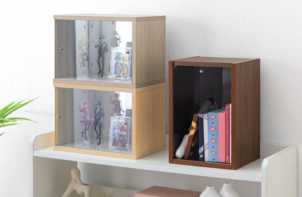 今回登場する本製品は、省スペースながら自由なレイアウトが可能で、推し活をより快適に楽しめるコレクションケースです。縦置き・横置きの両方に対応し、限られた空間でもお気に入りのアイテムを美しく飾ることができます。