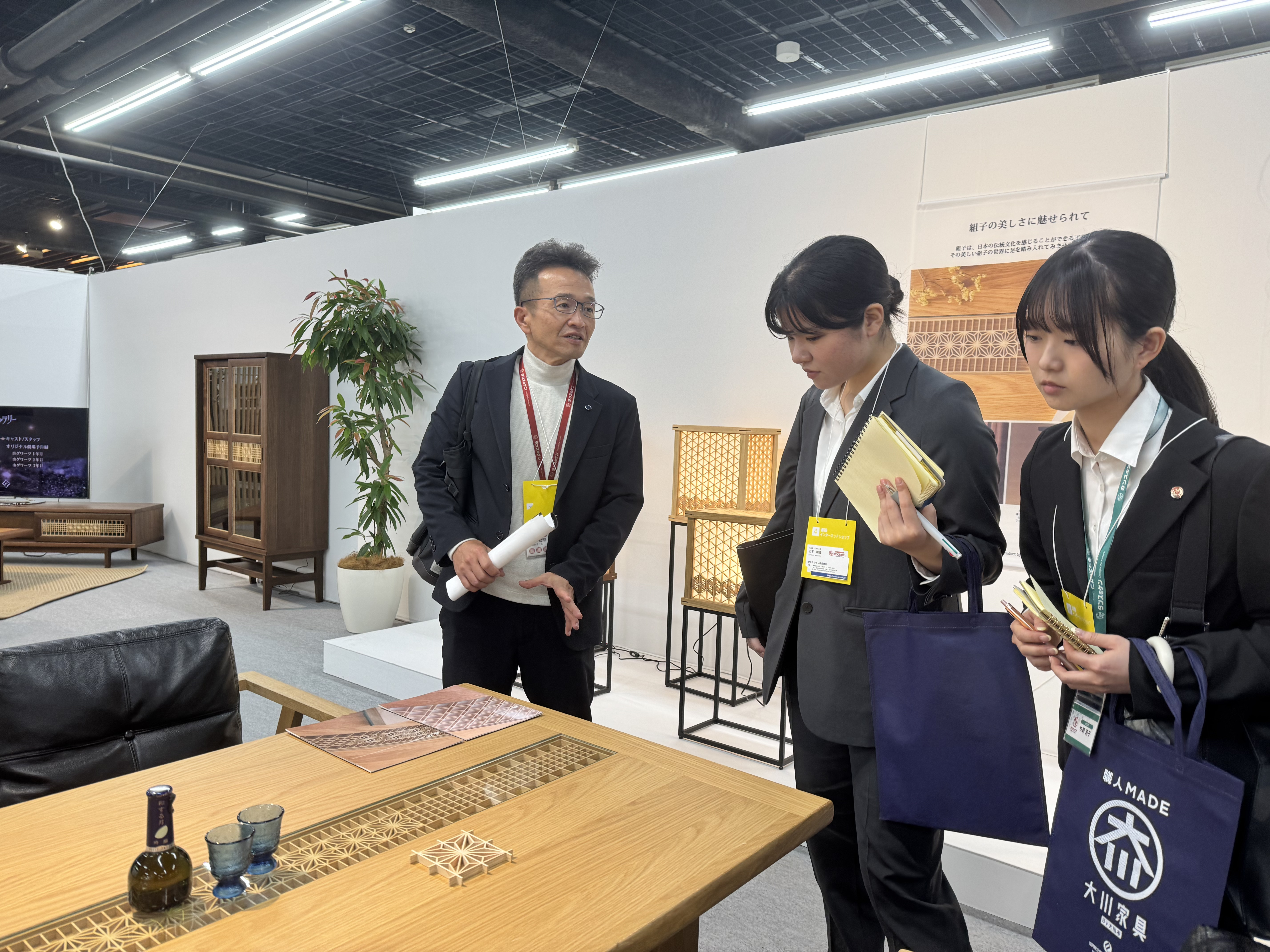 展示会視察では、さまざまなメーカーの家具やインテリア商品を見る中で、大川市の伝統工芸である「大川組子」にも触れることができました!